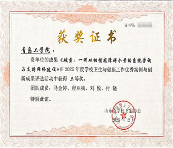三等奖:大学生心理健康与咨询中心团队(马金婷、程亚楠、刘悦、付饶)——《破茧:一例双相情感障碍个案的系统咨询与支持网络建设》;通识教育学院张洋、陈扬——《构建校地协同的校园传染病防控体系——青岛工学院卫生与健康工作经验总结》。