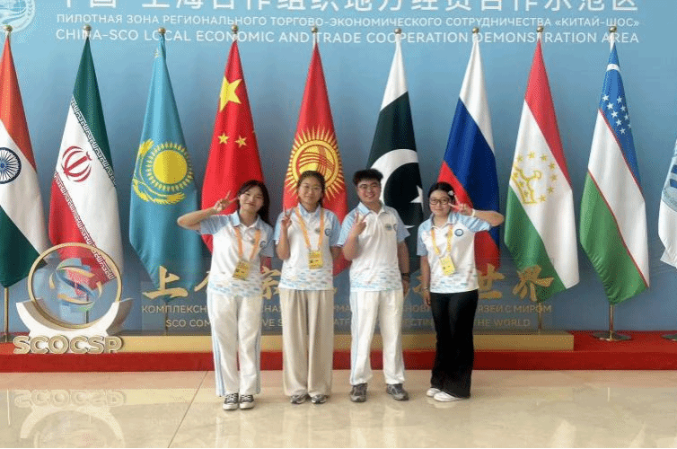 胡绮晨(右1)参与“2025(第四届)上海合作组织国际投资贸易博览会”志愿者服务