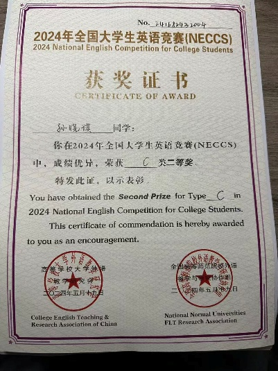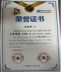 省市级奖项:第十一届全国大学生能源经济学术创意大赛省级三等奖;全国大学生英语翻译大赛省级二等奖