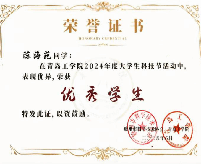校级奖项:青岛工学院“讲好中国故事”外语大赛校赛一等奖;青岛工学院2024年度大学生科技节活动获“优秀学生”称号