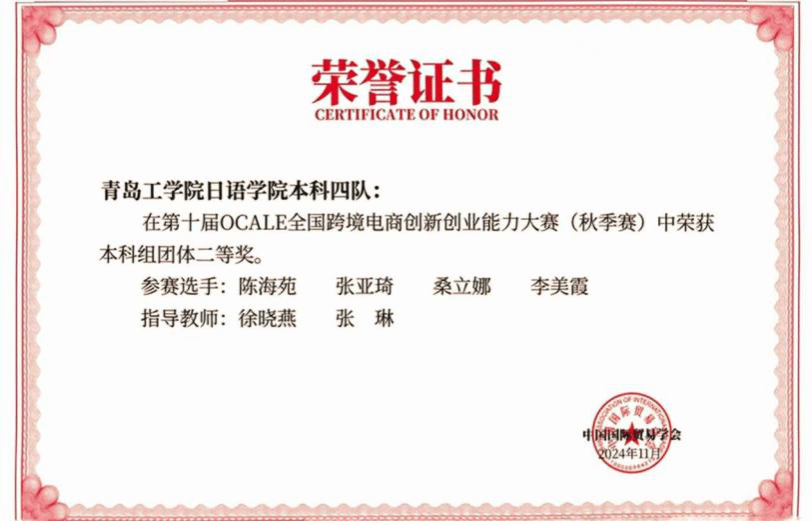 省市级奖项:第十五届全国大学生电子商务“创新、创意及创业”挑战赛山东赛区跨境电商实战赛特等奖;第十届OCALE全国跨境电商创新创业能力大赛(秋季赛)本科组团体二等奖;青岛市千名优秀大学生;第十七届山东省大学生科技节智慧供应链创新创业大赛——内外贸一体化数字品牌运营赛道省级二等奖