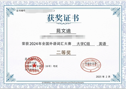 国家级奖项:“外研社·国才杯”“理解当代中国” 外语能力公开赛英语组综合能力赛项特等奖;全国外语词汇大赛大学C组二等奖;外文奖全国大学生英语语法大赛一等奖