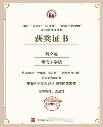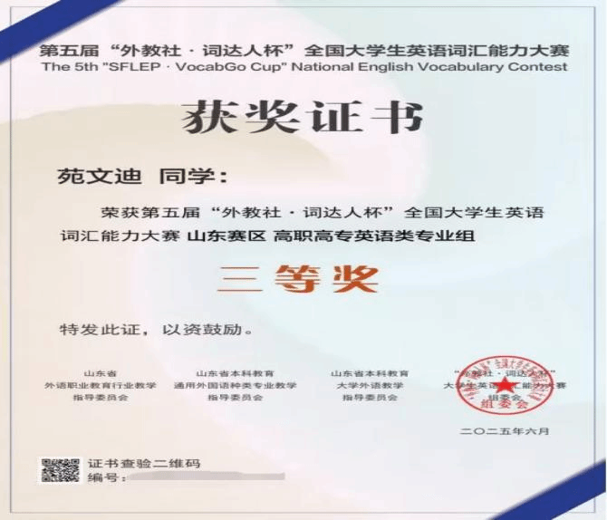 校级奖项:第五届“外教社·词达人杯”全国大学生英语词汇能力大赛青岛工学院二等奖