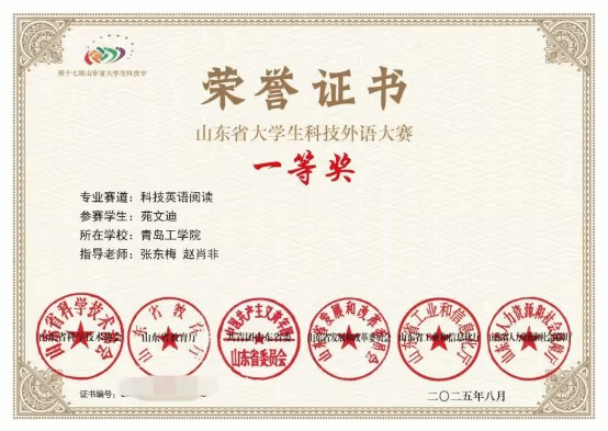 省市级奖项:山东省大学生科技外语大赛一等奖;第五届“外教社·词达人杯”全国大学生英语词汇能力大赛山东赛区三等奖
