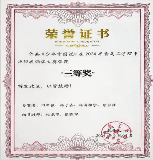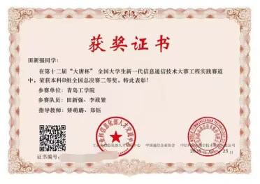 全国大学生物联网设计竞赛华北赛区一等奖;第十二届“大唐杯”全国大学生新一代信息通信技术大赛工程实践赛道山东赛区一等奖;全国大学生英语翻译大赛省一等奖;第21届全国大学生信息安全与对抗技术竞赛智能安全赛区域赛仿人智能体三等奖;第十六届蓝桥杯全国软件和信息技术专业人才大赛山东赛区Python程序设计大学B组三等奖;青岛市“爱我国防”主题演讲比赛三等奖;青岛市千名优秀大学生;山东省数学建模大赛省三等奖;全国大学生英语作文竞赛省级三等奖;第六届传智杯全国IT技能大赛省三等奖。