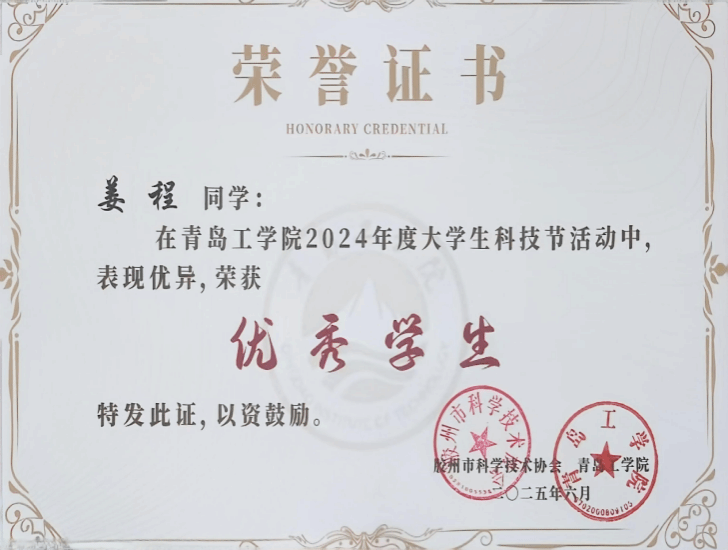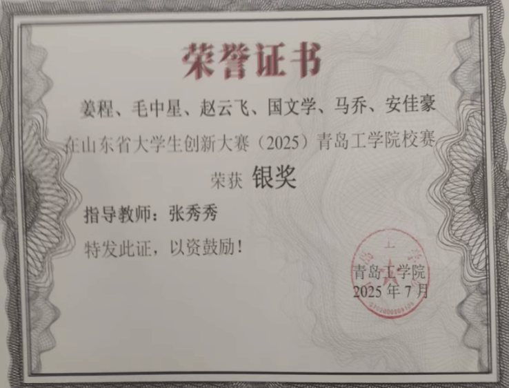 校级奖项:2024年获得校级二等奖学金;2025年山东省大学生创新大赛校级银奖