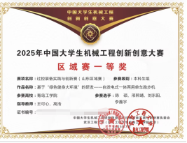 省市级奖项:第三届山东省高校智能机器人创意竞赛暨第七届中国高校智能机器人创意大赛一等奖;2025年中国大学生机械工程创新创意大赛过控装备实践与创新赛(山东区域赛)一等奖;第二十一届山东省大学生机电产品创新设计竞赛二等奖;第十五届山东省大学生科技节山东省大学生装备制造业创新大赛二等奖;第十六届山东省大学生科技节山东省大学生装备制造业创新大赛三等奖