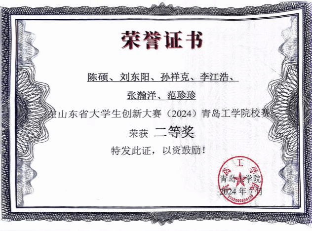 校级奖项:山东省大学生创新大赛(2024)青岛工学院校赛二等奖;第十届山东省大学生科技创新大赛校内赛一等奖