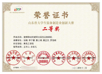 省级奖项:第十六届山东省大学生科技节山东省大学生装备制造业创新大赛省级二等奖;第十六届山东省大学生科技节山东省大学生装备制造业创新大赛省级三等奖;第十七届山东省大学生科技节山东省大学生先进成图技术与产品信息建模创新大赛机械产品信息建模省级三等奖;第十七届山东省大学生科技节山东省大学生先进成图技术与产品信息建模创新大赛机械成图技术团体省级三等奖。