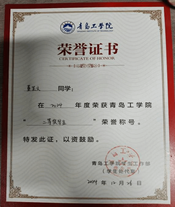 校级奖项:2024年青岛工学院“优秀学生”;2024年校级二等奖学金