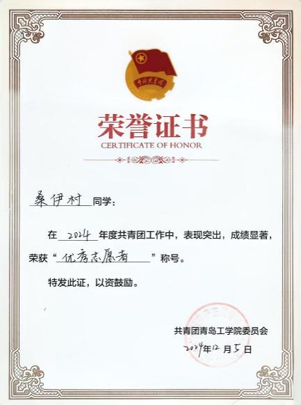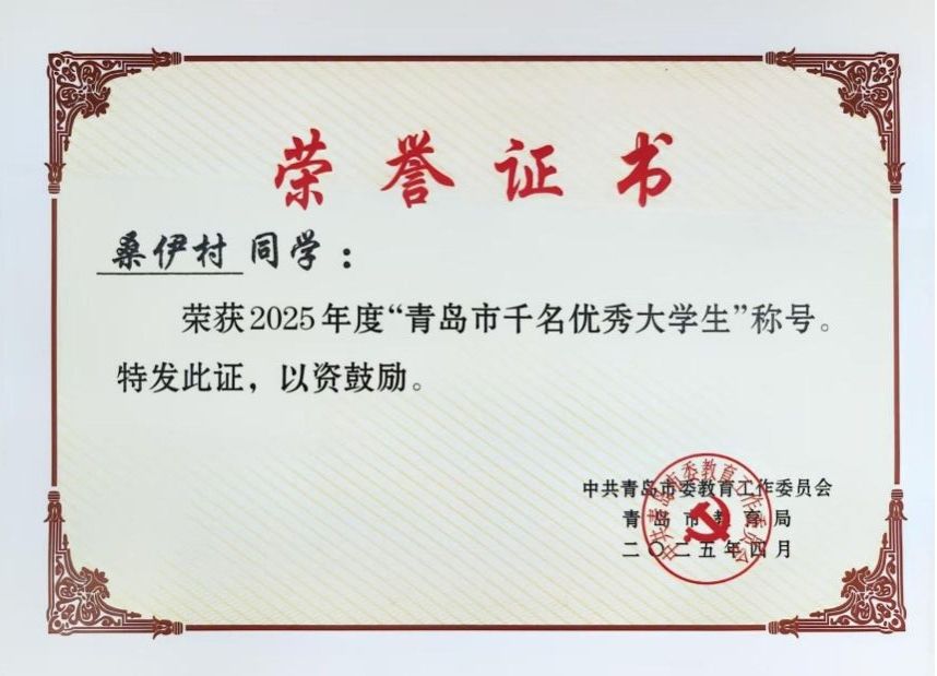 在第十七届山东省大学生科技节活动未来商业科技创新创业大赛中荣获“三等奖”;在2025年度荣获“青岛市千名优秀大学生”称号