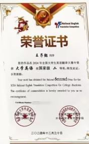 全国高校商业精英挑战赛文旅与会展创新创业竞赛国家级二等奖;第九届(2024)全国工商企业管理技能大赛国家级二等奖;2024年全国大学生英语翻译大赛国家级二等奖;全国企业竞争模拟大赛企业运营赛道(国家级三等奖