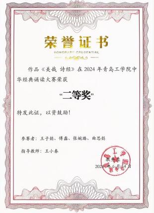 青岛工学院中华诵读大赛二等奖;山东省大学生创新大赛(2025)青岛工学院校赛金奖、银奖