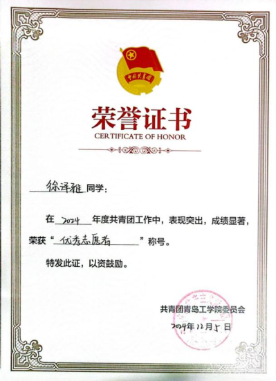 国际高校BIM毕业设计创新大赛选拔赛三等奖、2024年度优秀志愿者、2024年度优秀团干部、2024年度优秀学生、2024年度优秀学生干部、2024年度学校二等奖学金。