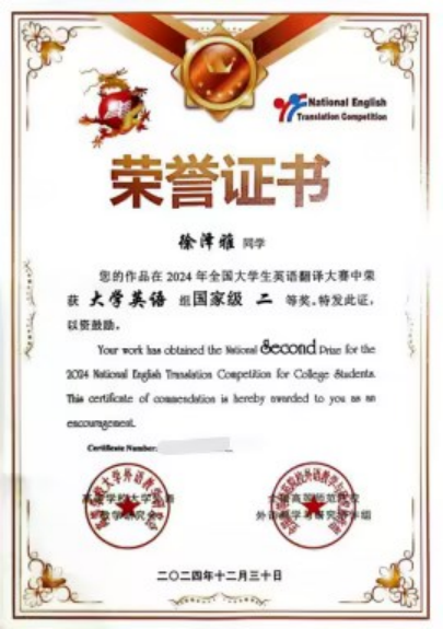 全国大学生英语翻译大赛二等奖;第十一届国际高校BIM毕业设计创新大赛优秀奖;全国大学生技术创新创业大赛三等奖;第三届“ETTBL杯”全国大学生英语能力大赛一等奖。
