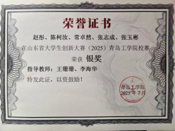 2024年度校级“优秀学生干部”、“优秀团干部”“二等奖学金”;山东省大学生创新大赛(2025)青岛工学院校赛银奖。