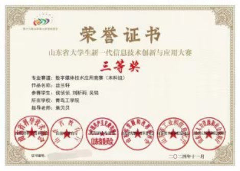 山东省大学生新一代信息技术创新与应用大赛三等奖;青鸟计划大学生实习实践活动证书。