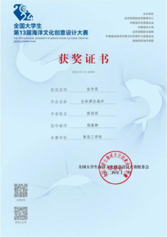 2024年第13届海洋文化创意设计大赛佳作奖;2024年文化强国杯知识挑战赛一等奖;2025年蓝桥杯AIGC全国赛二等奖。