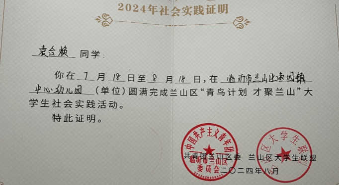 暑假里,他主动响应号召,参与“青鸟计划”暑期大学生返乡计划及“三下乡”社会实践活动,深入基层一线开展服务。