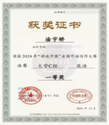 在激烈角逐中,她凭借扎实的专业功底、敏锐的跨文化思维与从容的表达能力,一路过关斩将,连续斩获四项国家级英语竞赛大奖,完成了从“勇敢参与者”到“实力获奖者”的华丽蜕变,让青春在竞技场上绽放耀眼光芒。