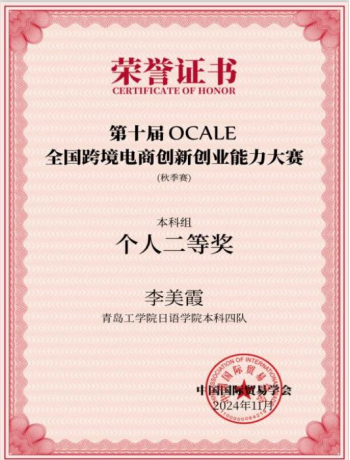 作为跨境电商赛场的“锐创者”,她凭借扎实的专业积淀与出色的团队协作,在第十届OCALE全国跨境电商创新创业能力大赛中脱颖而出,斩获个人与团体双二等奖。