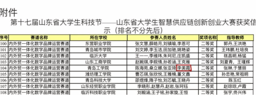 第十七届山东省大学生科技节——山东省大学生智慧供应链创新专业大赛二等奖。