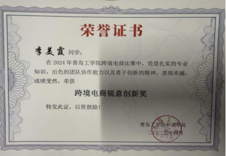 第十届OCALE全国跨境电商创新创业能力大赛团体二等奖;第十届OCALE全国跨境电商创新创业能力大赛个人二等奖;2024年全国啦啦操联赛(青岛站)第二名。