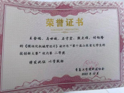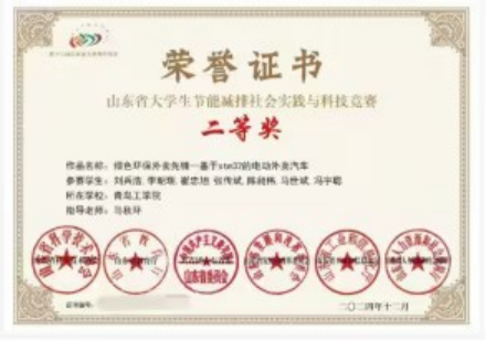 山东省大学生节能减排社会实践与科技竞赛省级二等奖。